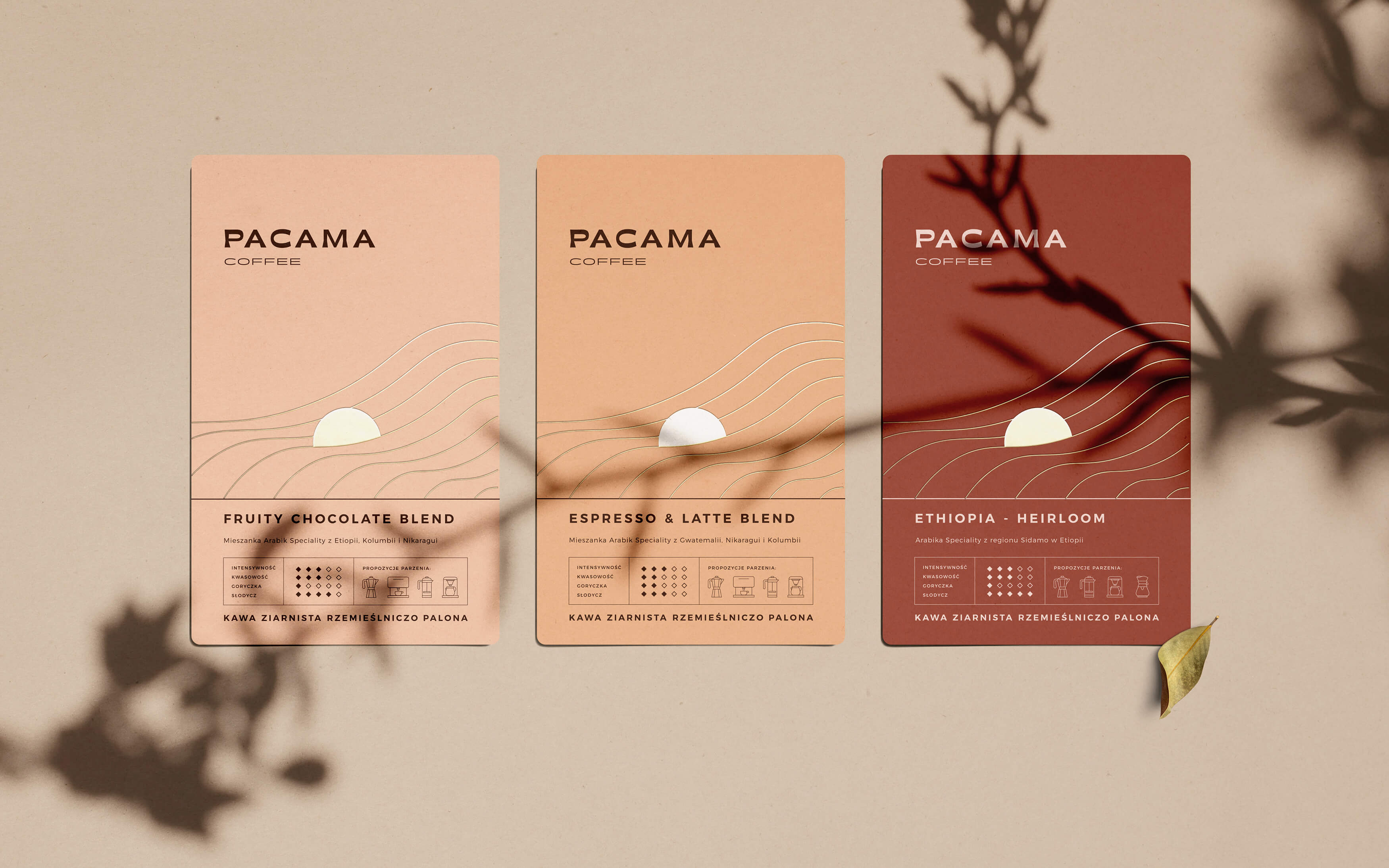 Identyfikację Pacama Coffee oparliśmy o połączenie klasycznego stylu z nowoczesną formą, jednocześnie zachowując indywidualny kraftowy charakter, daleki od estetyki dominującej zarówno w szeroko rozumianej branży FMCG jak również bezpośrednio w segmencie kaw speciality i premium.
